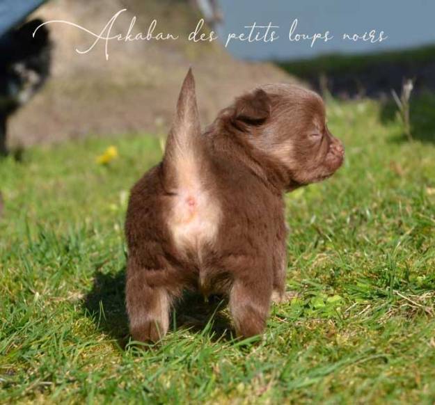 Mâle chocolat et tan, né le 30 janvier à 23h23 (déclaré au 31 janvier comme le reste de la portée) de l’union de Tchamarree ferme de laine & Pumbaa des petits loups noirs.